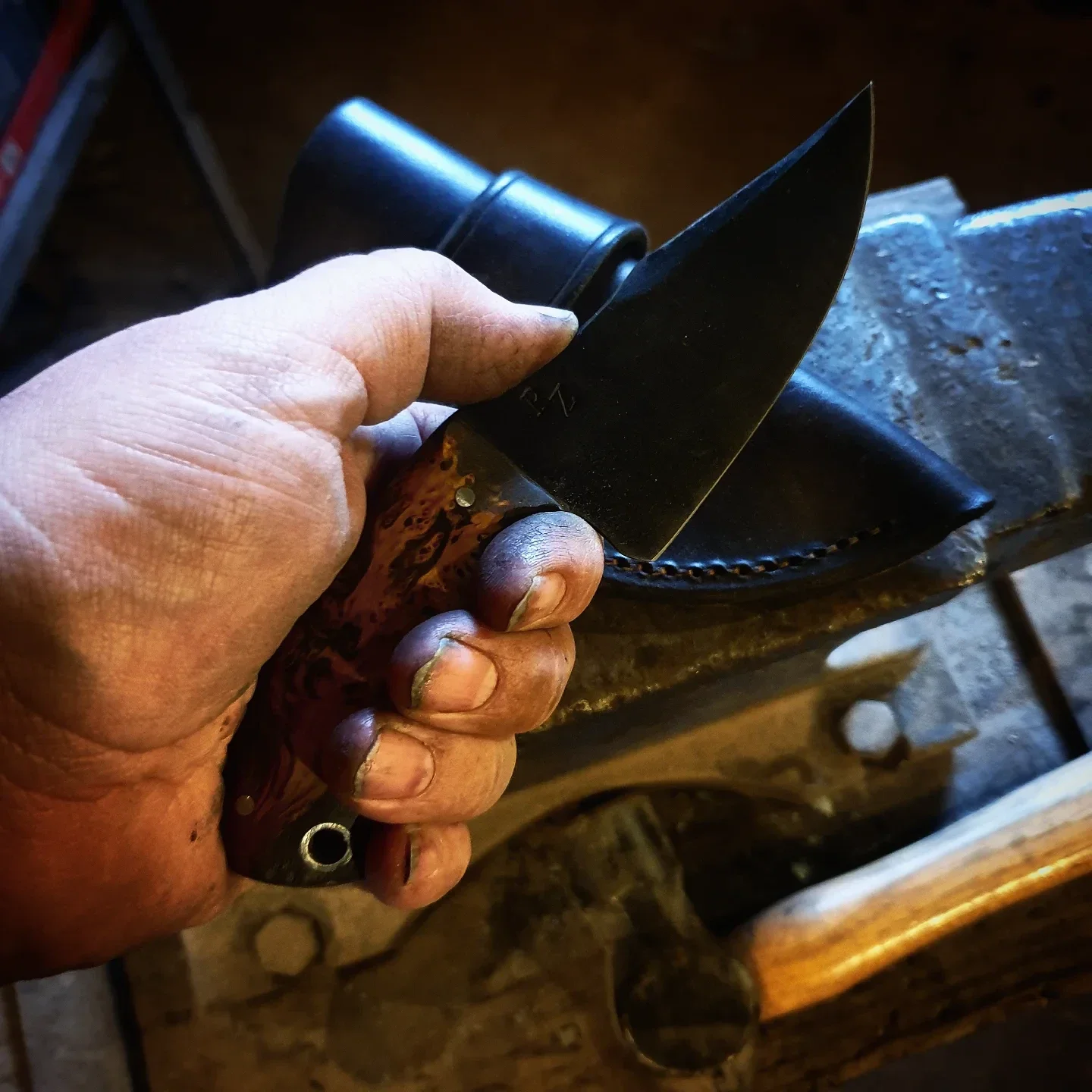 "Barra Syndicate" modele Hunter, etui cuir port scout, acier 80crv2 forgé, ma che en loupe de cerdre jaune UNIQUE .