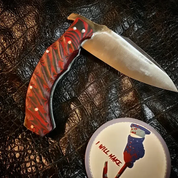 Manche en micarta bi colore noir et rouge , toxifié , sur doubles platines acier xc45